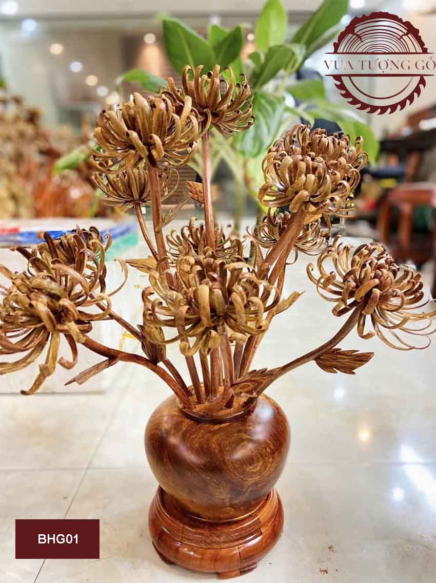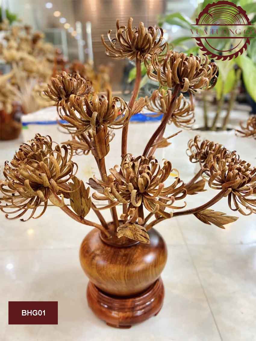 Bình hoa cúc 11 bông gỗ sưa BHG01 là sản phẩm trang trí tuyệt vời cho không gian thờ cúng trong nhà bạn.