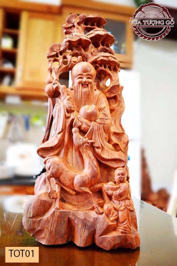 - Tượng tượng ông Thọ gỗ lũa TOT01 khắc họa hình ảnh ông Thọ với râu tóc bạc trắng, trán hói cao, trên tay cầm quả đào, với gương mặt hiền lành, mặc áo choàng màu vàng.
